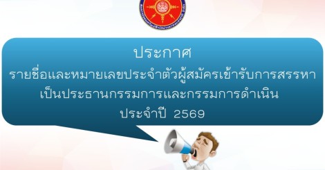 ประกาศรายชื่อและหมายเลขประจำตัวผู้สมัครเข้ารับการสรรหาเป็นประธานกรรมการและกรรมการดำเนินการ ประจำปี 2569